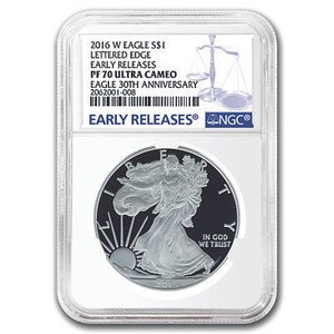 Proof coins (especially US mint coins) are simply something to behold. ", "I can't wait to get my hands on the 2016 Silver Eagle! ngc As you might expect, the smooth edge reading 30th Anniversary is a one-time alteration, and 2017 Proof American Silver Eagle and burnished coins will feature the usual reeded edge. If you are younger and having children to get one of these for the year of birth or, if older and doing the same for Grandchildren you are getting something that will have real value and sentiment many years down the road. ", "American eagles are the best in the world and recognized every where hands down. LIBERTY, 2016 and IN GOD WE TRUST are inscribed. ", " 30th pcgs pr70 strike proof dollar coin eagle flag silver american